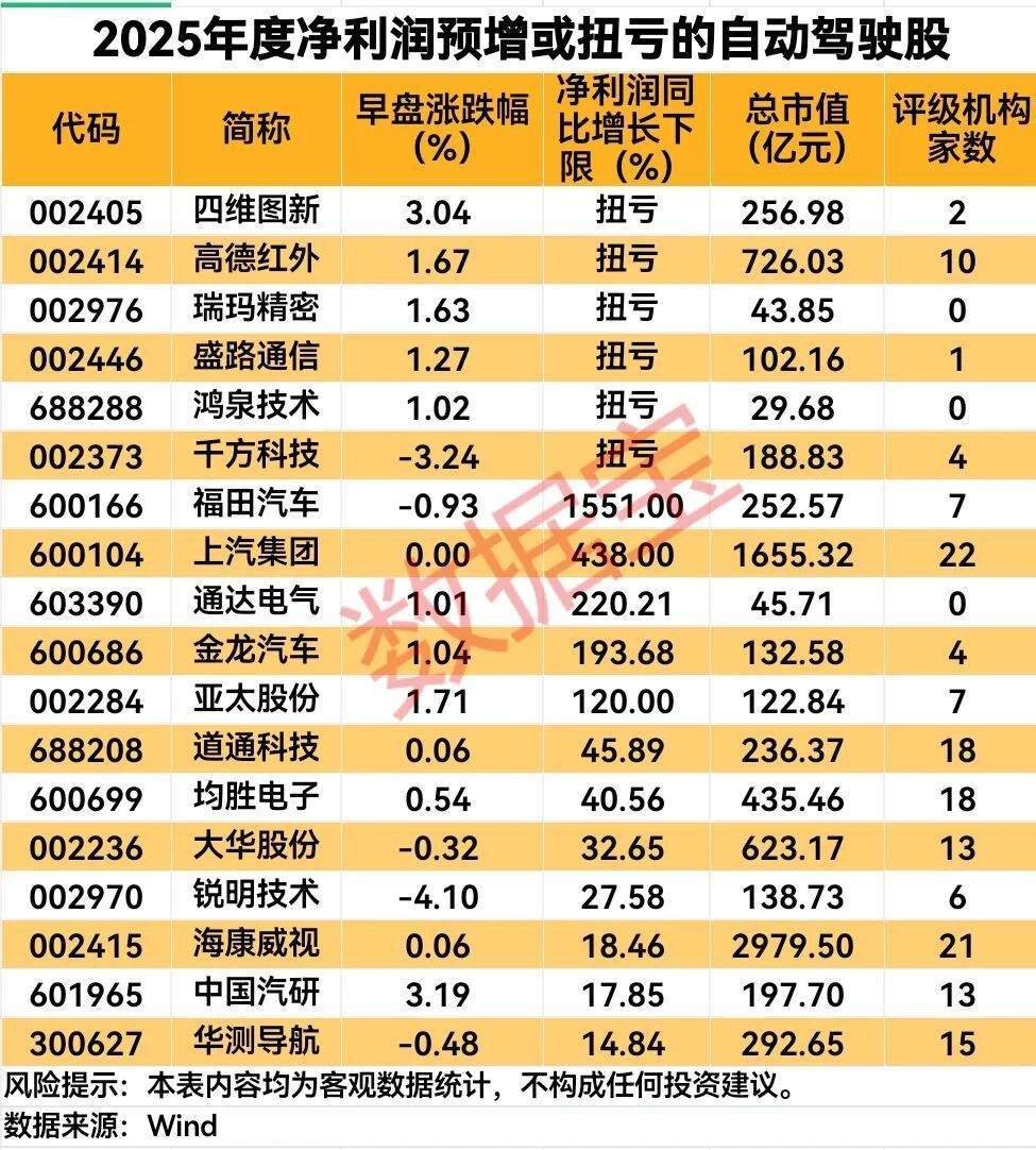 据证券时报·数据宝统计,A股中布局自动驾驶产业链的个股超过70只,2月13日早盘平均上涨1.03%,其中兴民智通、千里科技、浙江世宝股实现涨停,另外永新光学、万集科技、保隆科技、豪恩汽电上涨超过4%。